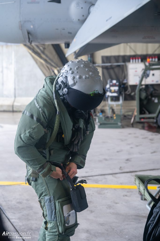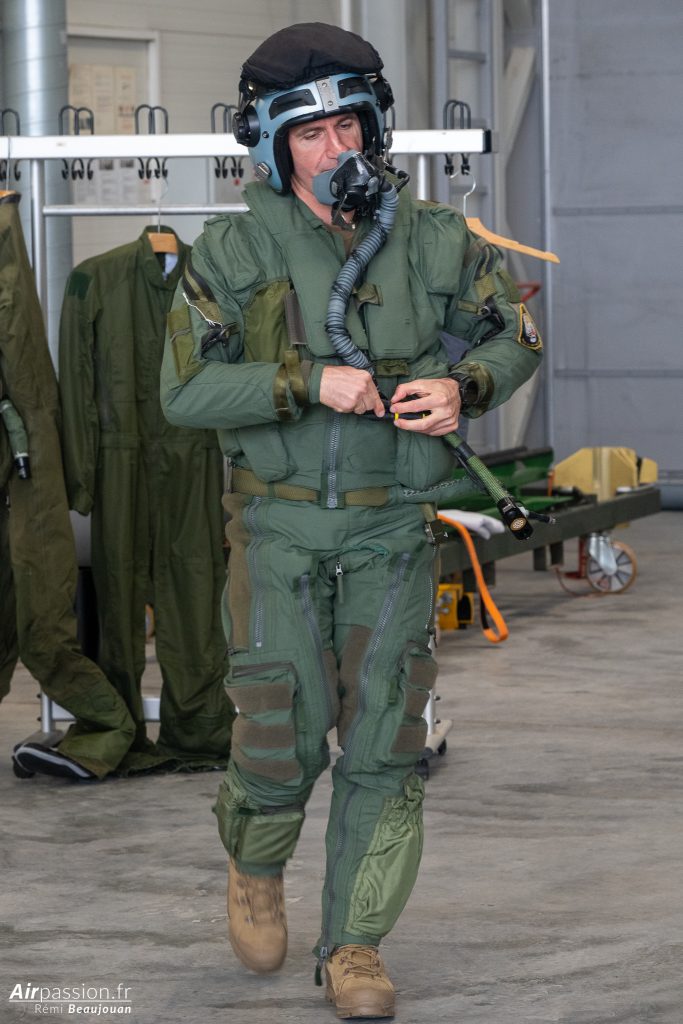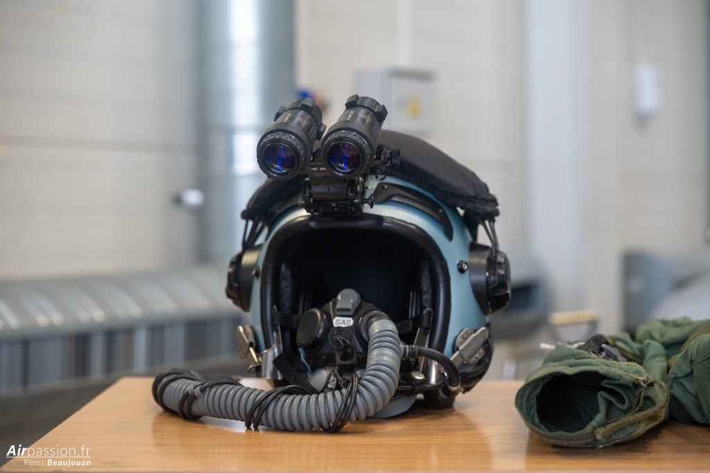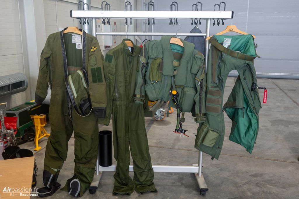 Puisque nous avons le temps, un pilote nous présente l’équipement des pilotes avec les combinaisons de vol, le pantalon anti-G et le casque de pilote équipé de jumelles de vision nocturne. Apparemment, la combinaison de vol utilisée pour les vols au-dessus de la mer, avec ses protections contre l’hypothermie ne fait pas le bonheur des pilotes car difficile à enfiler et peu confortable. La traditionnelle combinaison de vol, plus légère a leur préférence.