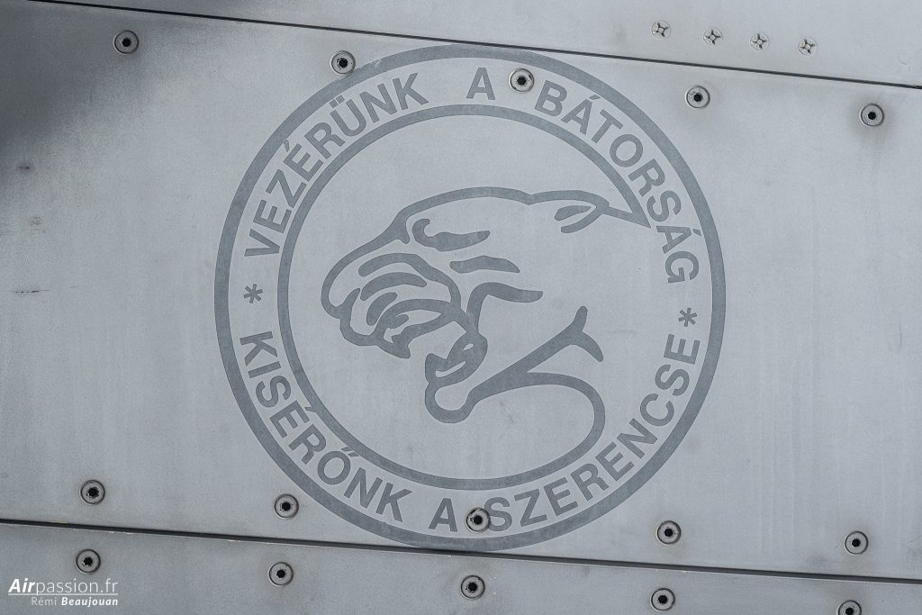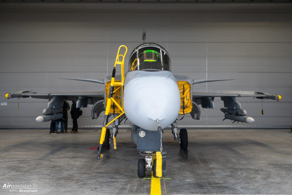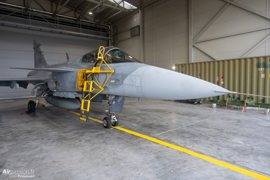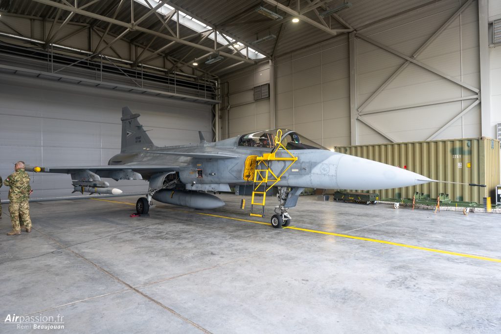 Dans le hangar trône un JAS 39 Gripen C. Cet avion est un monoplace d’origine suédoise produit par SAAB. La Hongrie possède actuellement 11 monoplaces et 1 biplace. Ces avions sont en location jusqu’en 2026, date à laquelle la Hongrie en deviendra propriétaire.