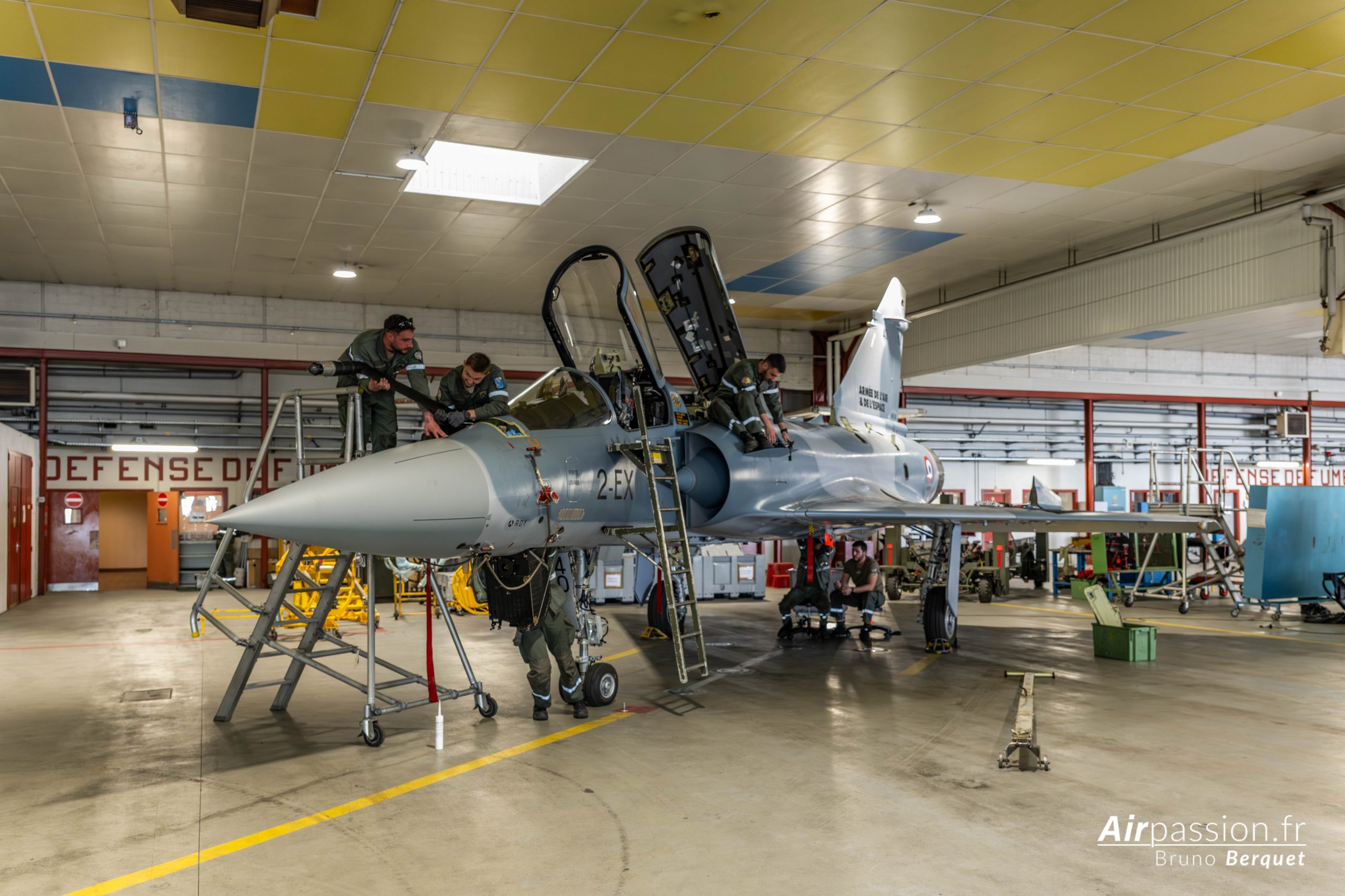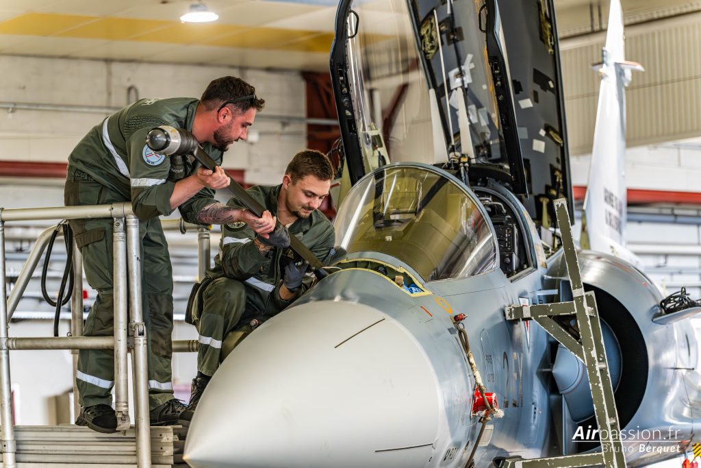 Notre découverte de la base commence par la visite des ateliers (ESTA 15.002 Haute-Saône). Chaque atelier regroupe des mécaniciens, des techniciens avioniques et des spécialistes armement, formés pour travailler sur les spécificités des réacteurs M53. Le colonel Emmanuel Roux, commandant la base aérienne de Luxeuil, nous rappelait dans son discours lors des cérémonies des 40 ans du Mirage 2000 que pour maintenir une vingtaine de Mirage 2000-5 en vol, on compte environ 300 mécaniciens pour 20 avions, soit une proportion de 15 mécaniciens par avion. Cette organisation reflète l’importance cruciale de la maintenance pour la sécurité et l’efficacité des missions.