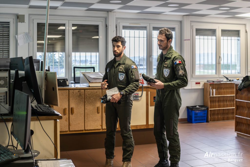 Nous suivons ensuite deux pilotes dans la préparation de leur mission, briefing, habilement, prise en compte des avions… la mission du jour : pour un des pilotes, escorter 2 Mirage 2000D de Nancy dans leur mission de bombardement, le second jouera l’ennemi en tentant d’attaquer le chasseur de protection et les 2 Mirage 2000D. Au retour de la mission débriefing du vol entre les deux pilotes et ensuite avec les 2 équipages de Nancy.