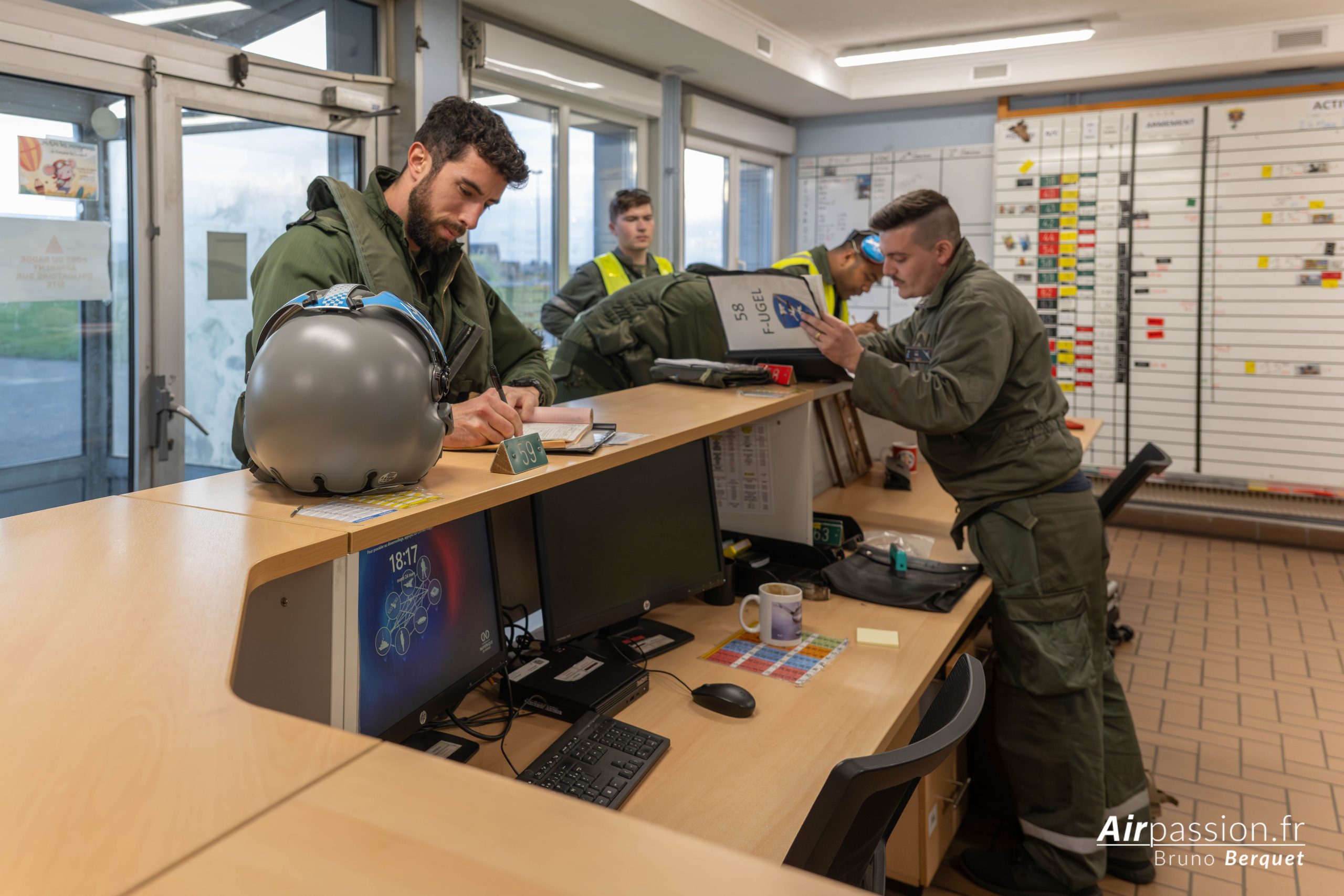 Nous quittons l’ESTA pour rejoindre le CDT Antoine « Flush », adjoint aux opérations du 1/2 Cigognes, dont la mission est de planifier l’activité de l’escadron sur une durée plus ou moins longue et de gérer le déploiement de l’unité sur cette activité. Il nous décrit les missions du groupe de chasse :
